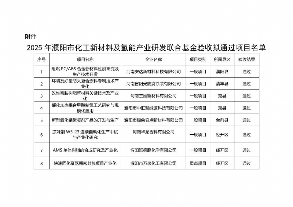 附件:2025年濮阳市化工新材料及氢能产业研发联合基金验收拟通过项目名单