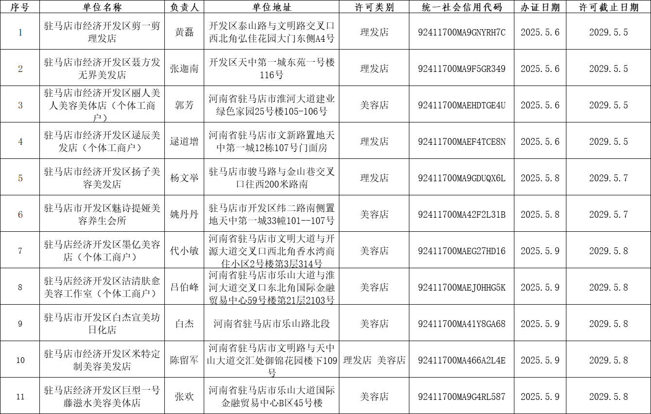 公共场所卫生许可公示(2025.5.6-2025.5.9)
