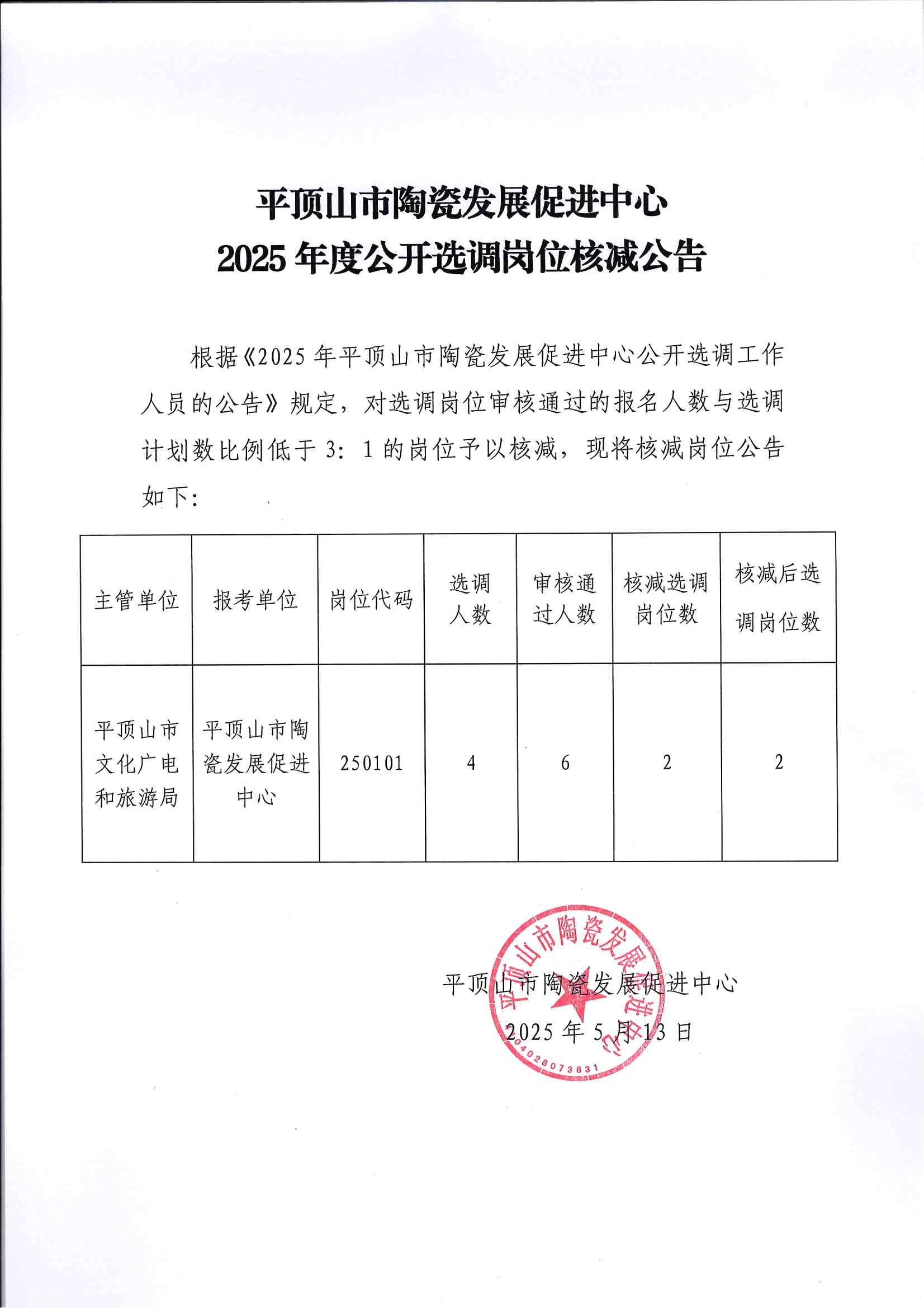 平顶山市陶瓷发展促进中心2025年度公开选调岗位核减公告