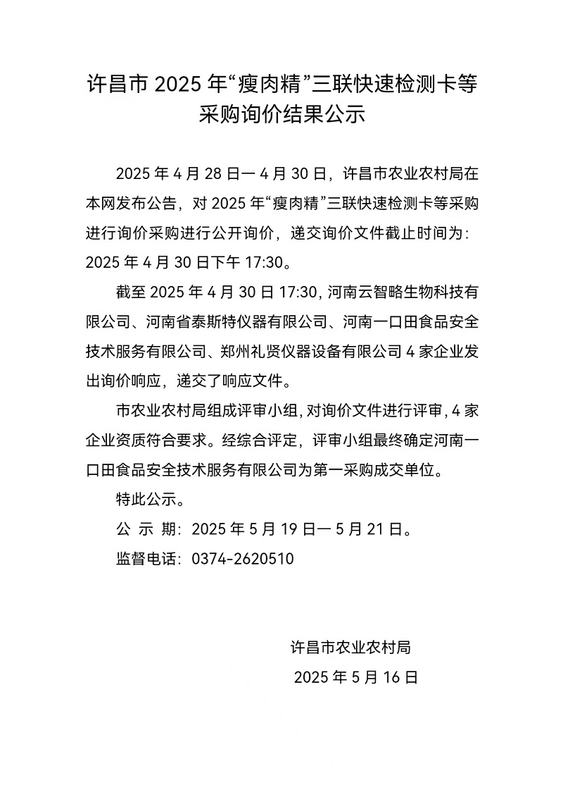 许昌市2025年"瘦肉精"三联快速检测卡等采购询价结果公示
