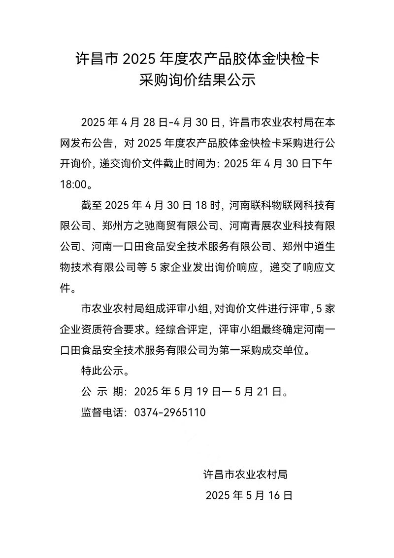 许昌市2025年度农产品胶体金快检卡采购询价结果公示