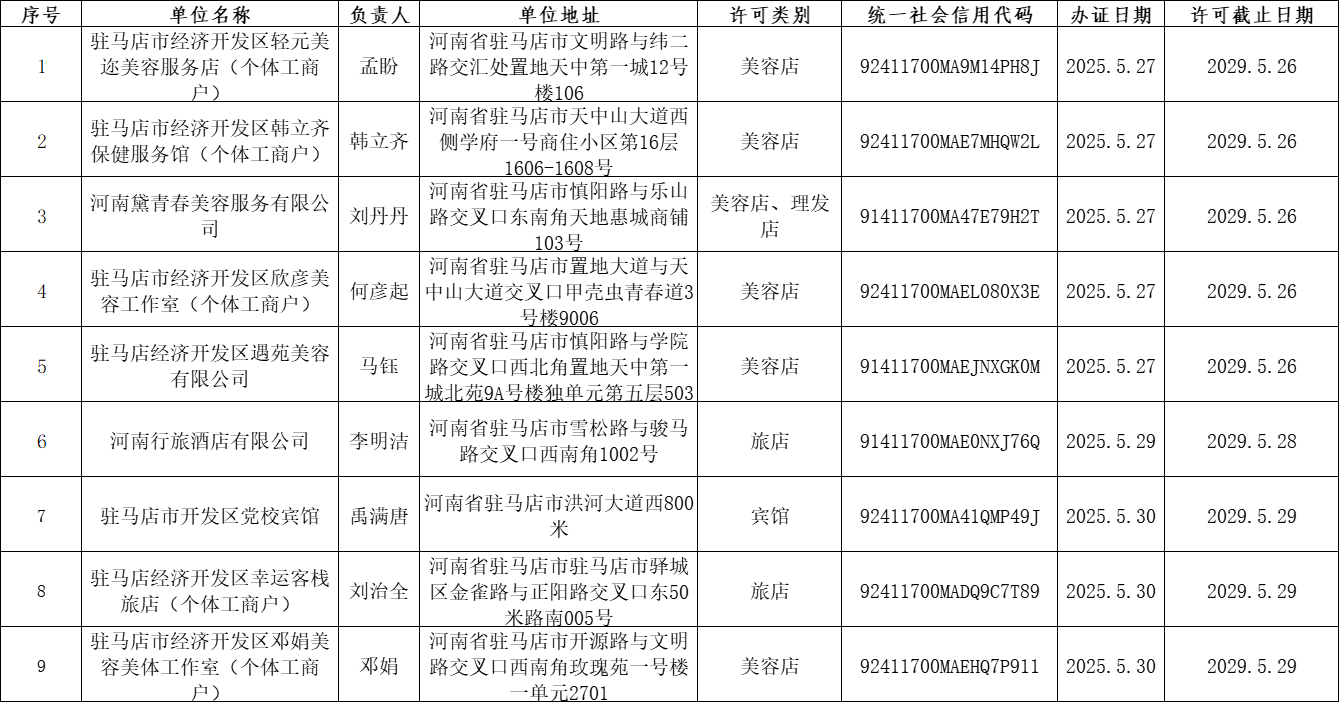 公共场所卫生许可公示(2025.5.26-2025.5.30)