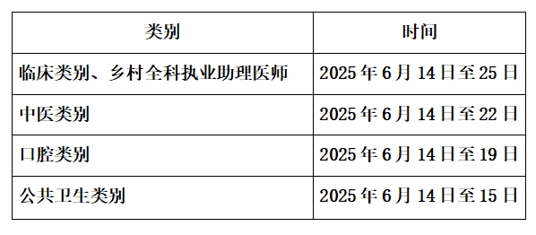 (二)关注各类别考试时间。2025年各类别实践技能考试时间总体安排如下,请考生及时查看各考区考点的具体安排,按准考证上的时间与地点参加考试,千万不要错过考试时间。