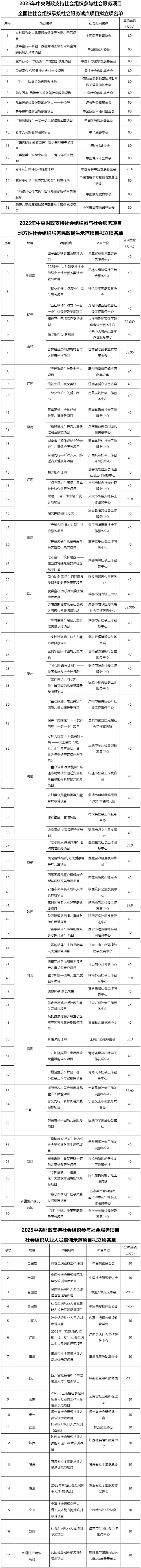 根据民政部办公厅《2025年中央财政支持社会组织参与社会服务项目实施方案》(民办函〔2025〕20号),经组织申报、推荐审核和专家评审,确定了2025年中央财政支持社会组织参与社会服务项目拟立项名单(93个,见附件),现予公示。