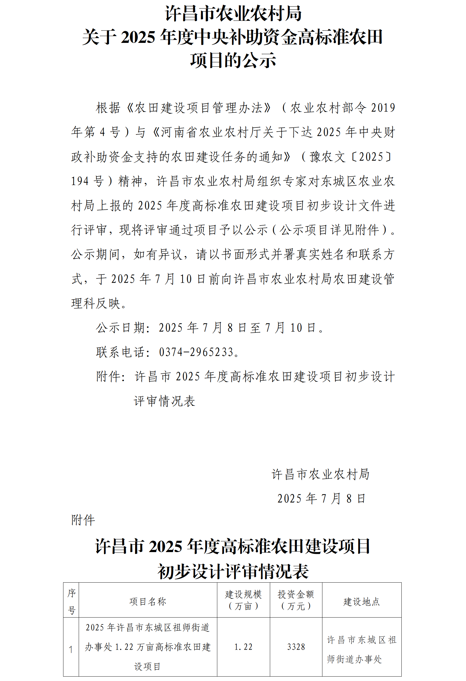 许昌市农业农村局关于2025年度中央补助资金高标准农田项目的公示