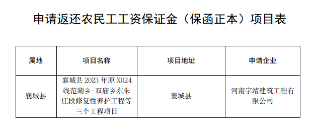 根据《河南省工程建设领域农民工工资保证金实施办法》(豫人社规〔2022〕4号),现对申请返还农民工工资保证金(保函正本)工程项目予以公示,如该项目涉及拖欠农民工工资问题,请于公示期内进行反馈,并提供有关证据材料。