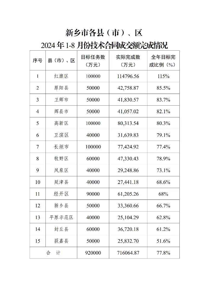 新乡市各县(市)、区2024年1-8月份技术合同成交额完成情况