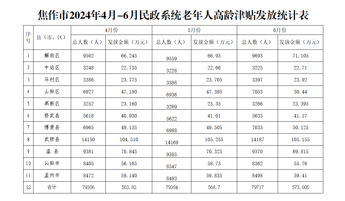焦作市2024年第二季度民政系统 高龄津贴发放情况公示