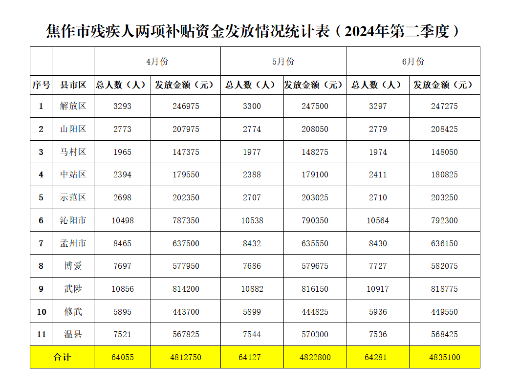 焦作市2024年第二季度残疾人两项补贴资金发放情况公示