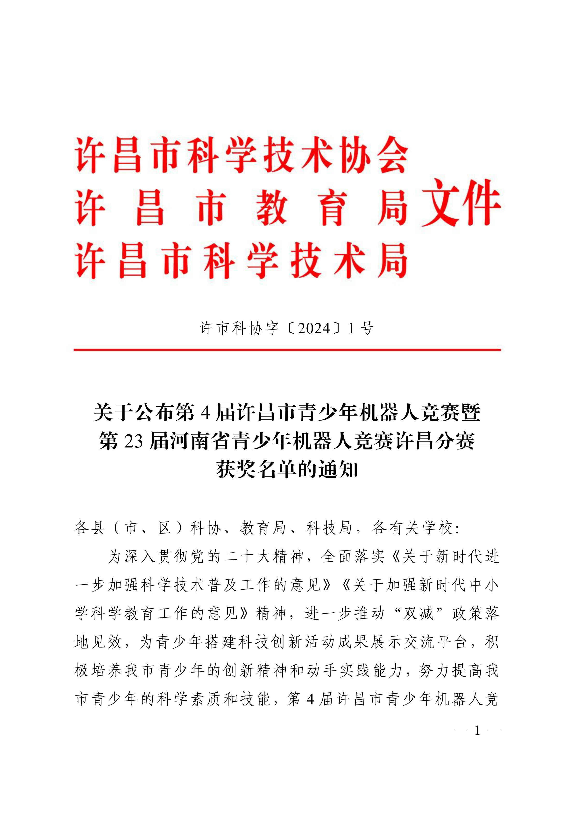 关于公布河南省第24届青少年机器人竞赛许昌选拔赛暨许昌市第5届青少年机器人竞赛获奖名单的通知